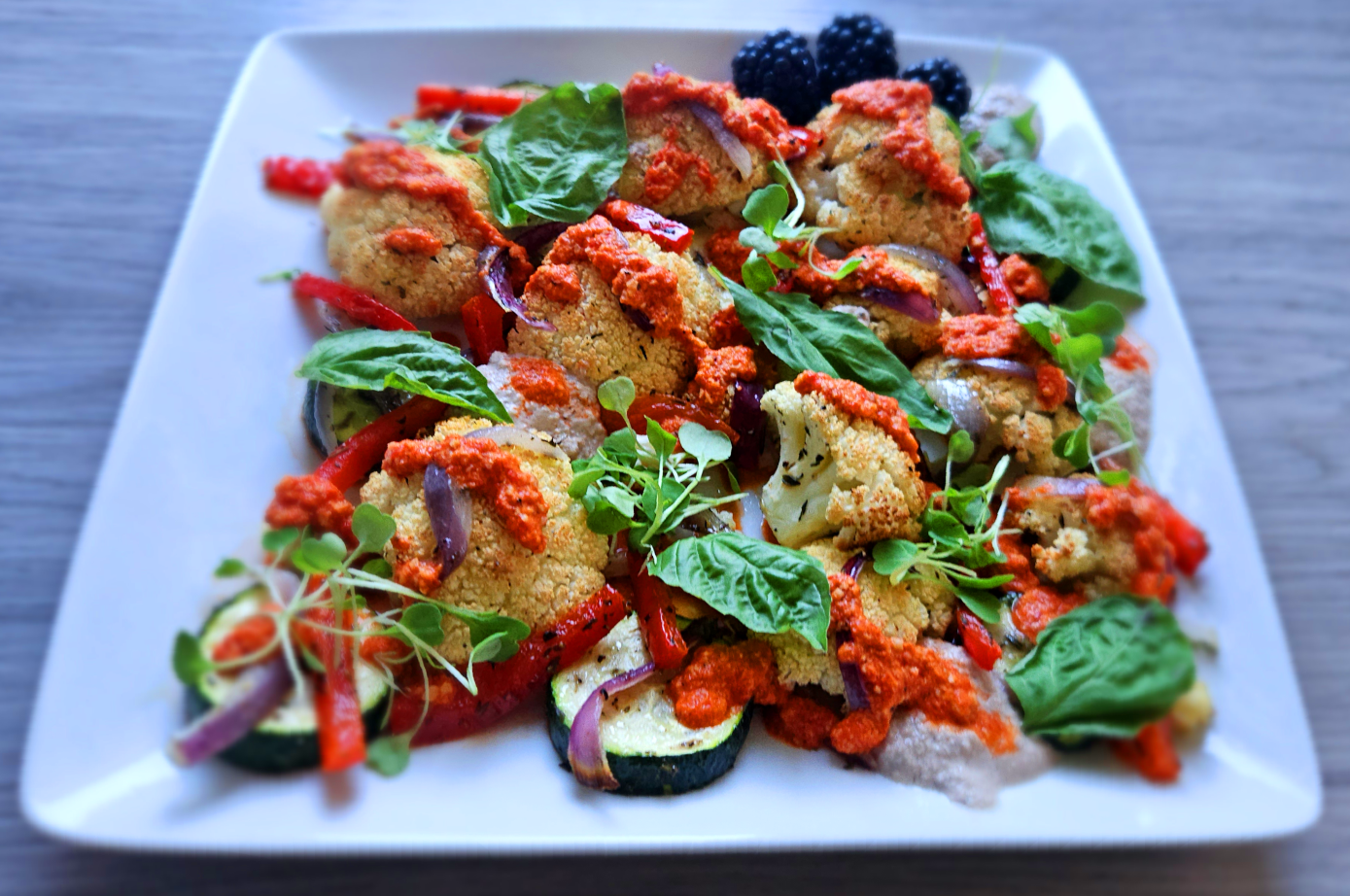 Deconstructed Roasted Vegetable and Walnut “Ricotta” with Roasted Red Pepper Drizzle