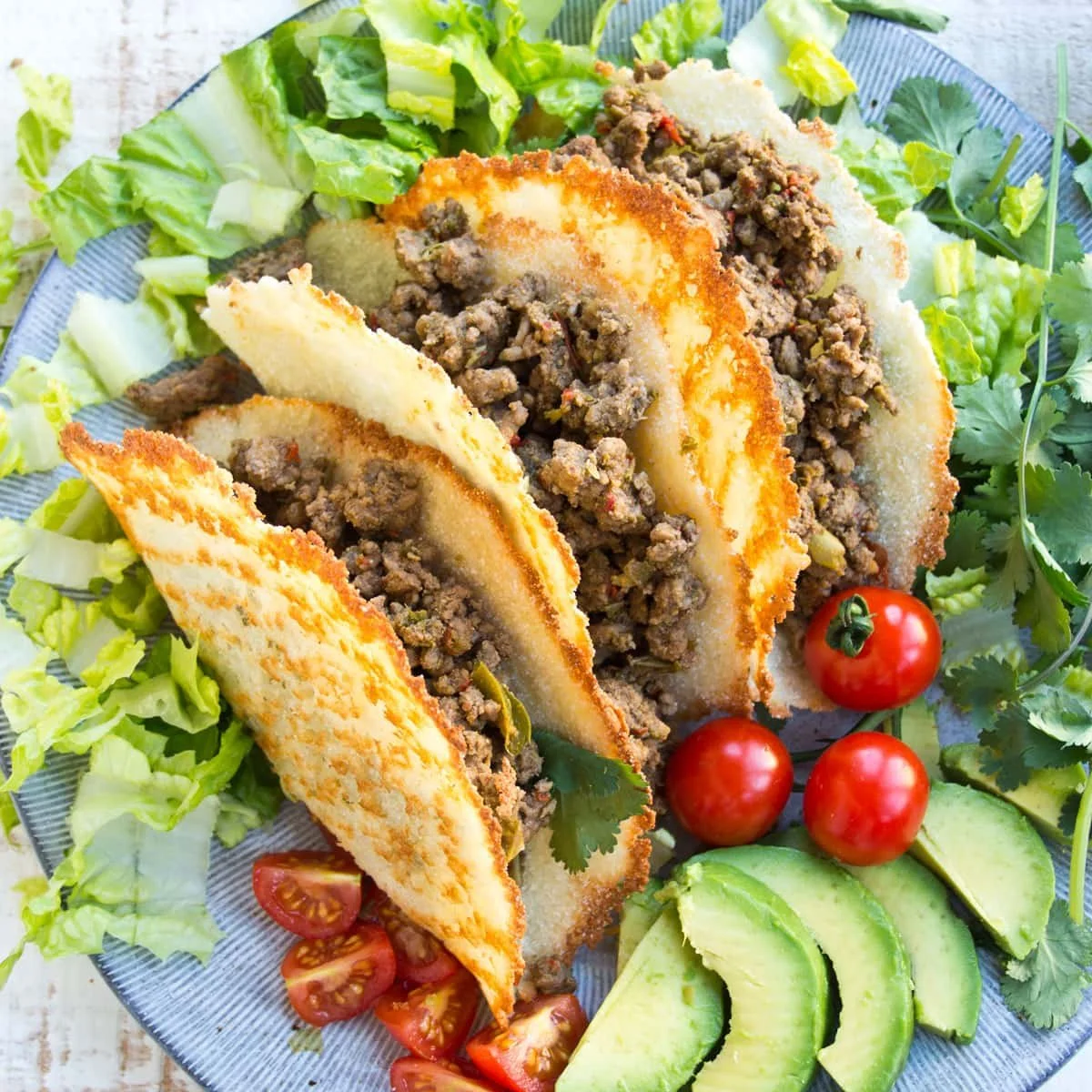 Cheesy Shell Zero Carb Beef and Avocado Tacos with Lemon Crema and Tomato